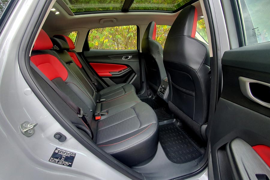 |  Красные вставки на спинках сидений и дверных картах оживляют черный салон