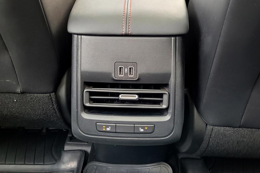 Сзади просторно, трансмиссионный тоннель практически отсутствует, поэтому третий пассажир здесь не будет лишним. Из удобств есть откидной подлокотник с двумя подстаканниками, два USB разъема и обогревы сидений.