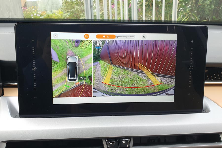 Салон GAC чересчур оцифрован, аналоговых переключателей почти нет. Экраны виртуальной приборки и мультимедиа стоят раздельно. Последний, по китайским меркам, невелик (10,1 дюйма), да и картинка с камер не фонтан. Зато есть круговой обзор, изображение с высоты птичьего полета и даже точный замер расстояния до препятствия.